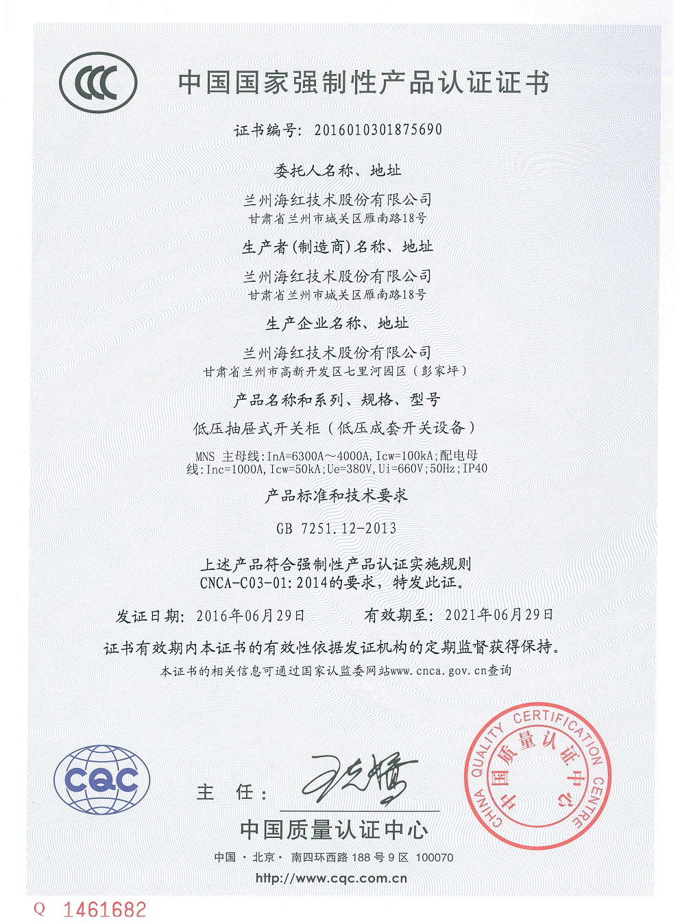 我公司的“低壓抽屜式開關(guān)柜(低壓成套開關(guān)設(shè)備)MNS(6300A-4000A)”通過國家CCC產(chǎn)品認證并取得證書