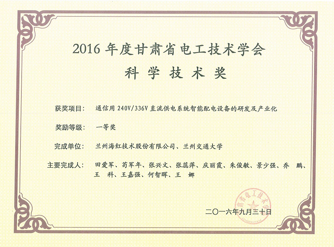 我公司“通信用240V/336V直流供電系統(tǒng)智能配電設(shè)備的研發(fā)及產(chǎn)業(yè)化”項目榮獲2016年度甘肅省電工技術(shù)學會科學技術(shù)獎一等獎