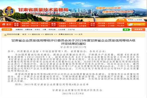 我公司再次被評定為“甘肅省企業(yè)質(zhì)量信用等級AA級企業(yè)”