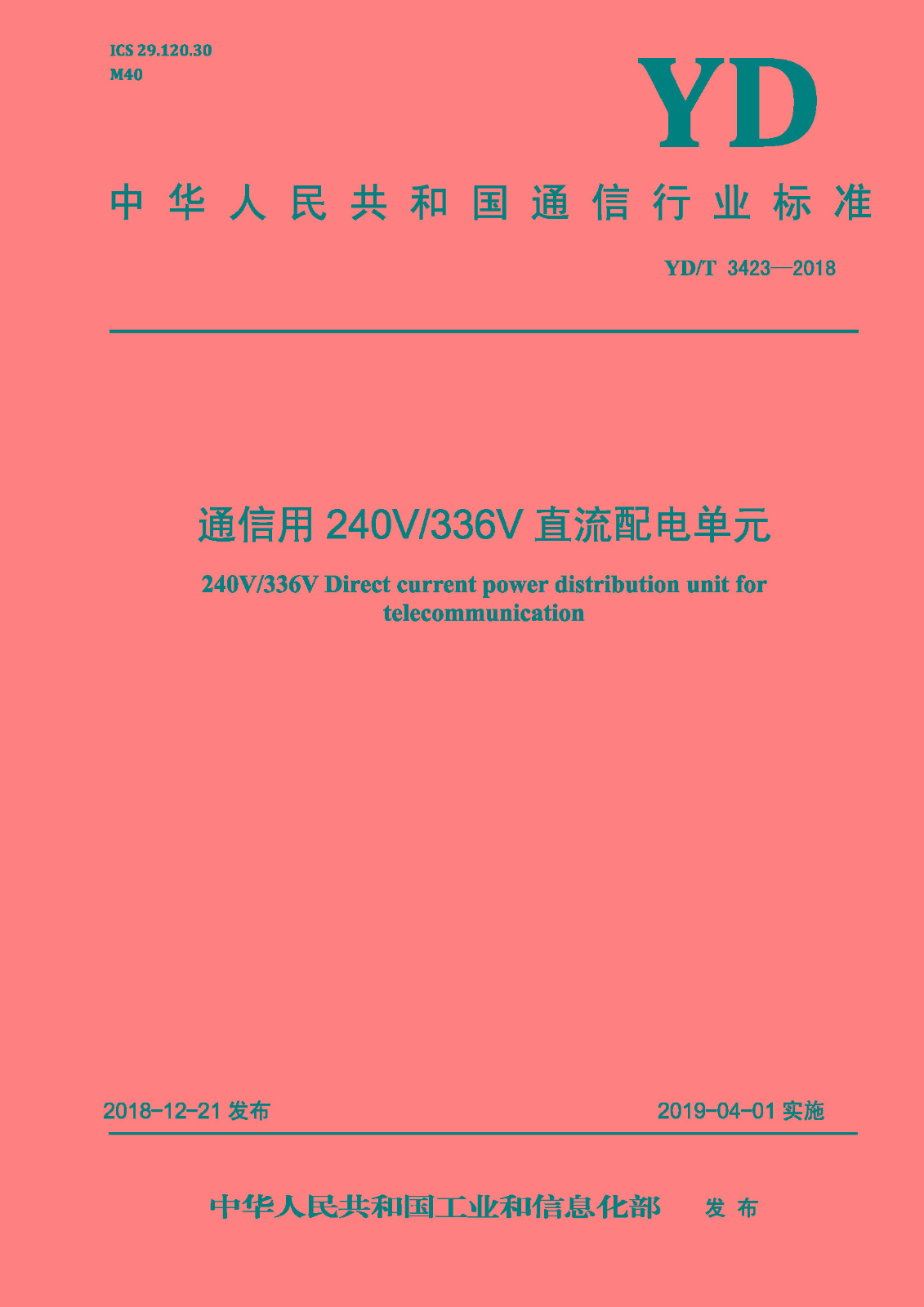 我司參與起草的《通信用240V/336V直流配電單元》(YD/T 3423-2018)行業(yè)標(biāo)準(zhǔn)經(jīng)中華人民共和國(guó)工業(yè)和信息化部批準(zhǔn)發(fā)布,已于2019年04月01日實(shí)施。我司技術(shù)中心研...