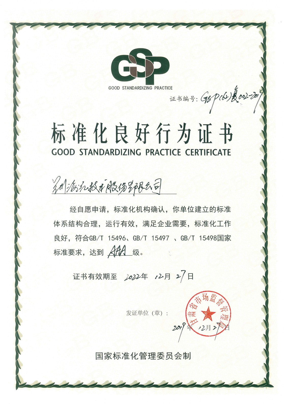 我司再次被省市場(chǎng)監(jiān)督管理局認(rèn)定為“AAA級(jí)標(biāo)準(zhǔn)化良好行為企業(yè)”
