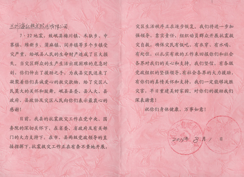 8月初,蘭州海紅技術股份有限公司收到了來自甘肅省民政廳、岷縣人民政府的感謝信。