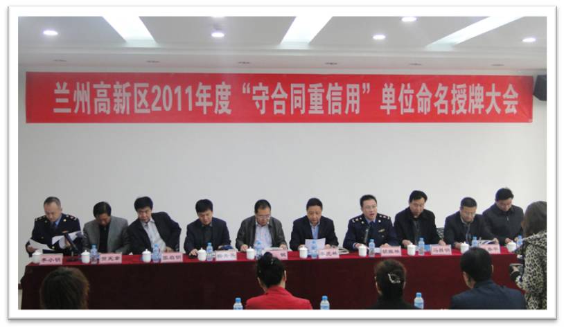 會議當(dāng)天,蘭州高新區(qū)主要領(lǐng)導(dǎo)對所有“守合同、重信用”企業(yè)進行授牌。我公司行政人資中心總經(jīng)理焦旭麗作為3家企業(yè)代表之一,在現(xiàn)場做了守重工作匯報及交流。高新區(qū)管委會主任李虎林在會議上強調(diào),企業(yè)信用建設(shè)是一項長期的工作,任重道遠,要堅持以科學(xué)發(fā)展觀為指導(dǎo),踏實工作,開拓創(chuàng)新,切實加強企業(yè)信用體系建設(shè),為把蘭州高新區(qū)建成促進全市經(jīng)濟社會率先跨越發(fā)展的重要戰(zhàn)略支點做出新的貢獻。